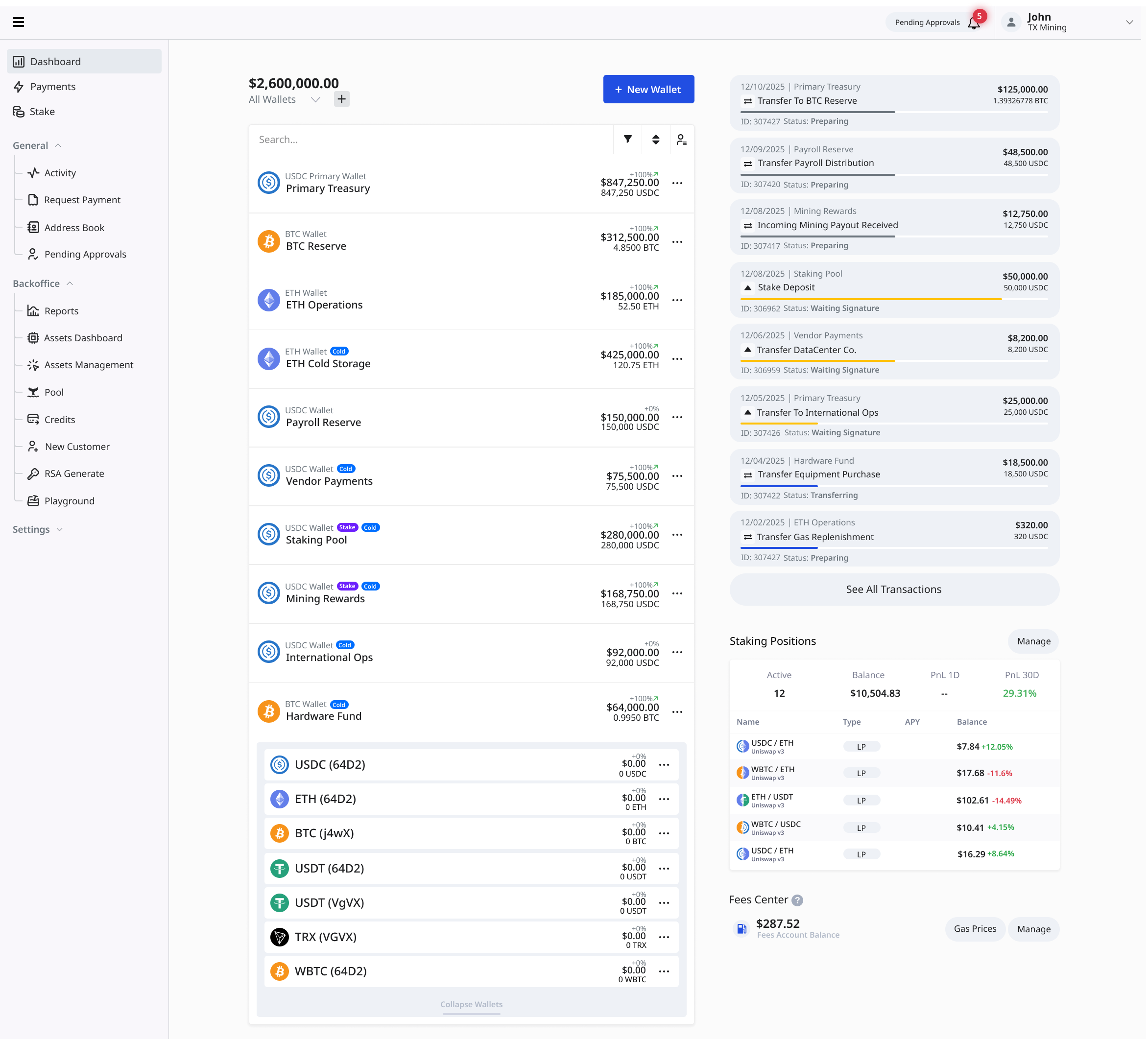 One platform for mining operations, stablecoin banking, MPC wallets, credits cards, and digital asset management that is secured with institutional controls and automated workflows.